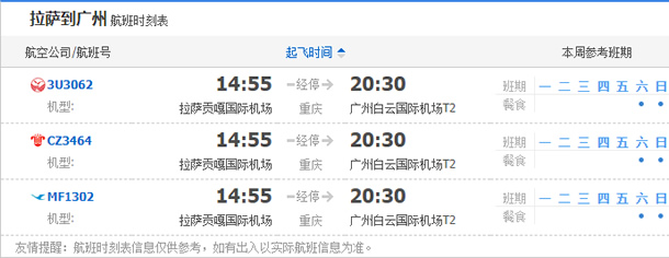 以上就是拉薩飛廣州的航班時(shí)刻表,起飛時(shí)間,到達(dá)時(shí)間,及固定航班日期。